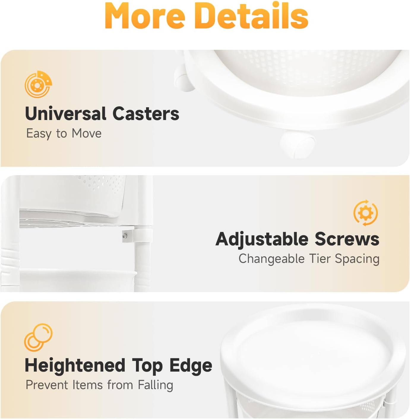 Adjustable Height: It comes with adjustable screws, and the tier spacing can be adjusted to fit the space required for storing different items.