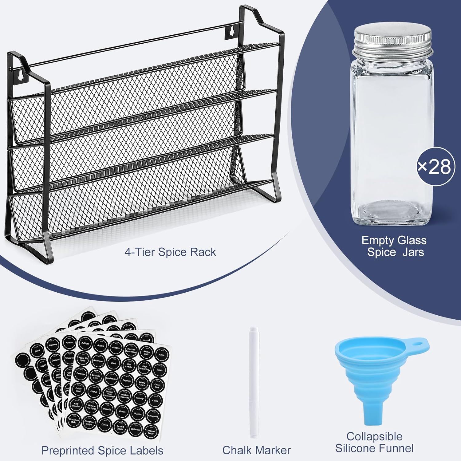 AOZITA Spice Rack Organizer with 28 Empty Spice Jars with Silver Lids, Funnel, Labels - Seasoning Organizer for Countertop, Cabinet, Kitchen, Pantry