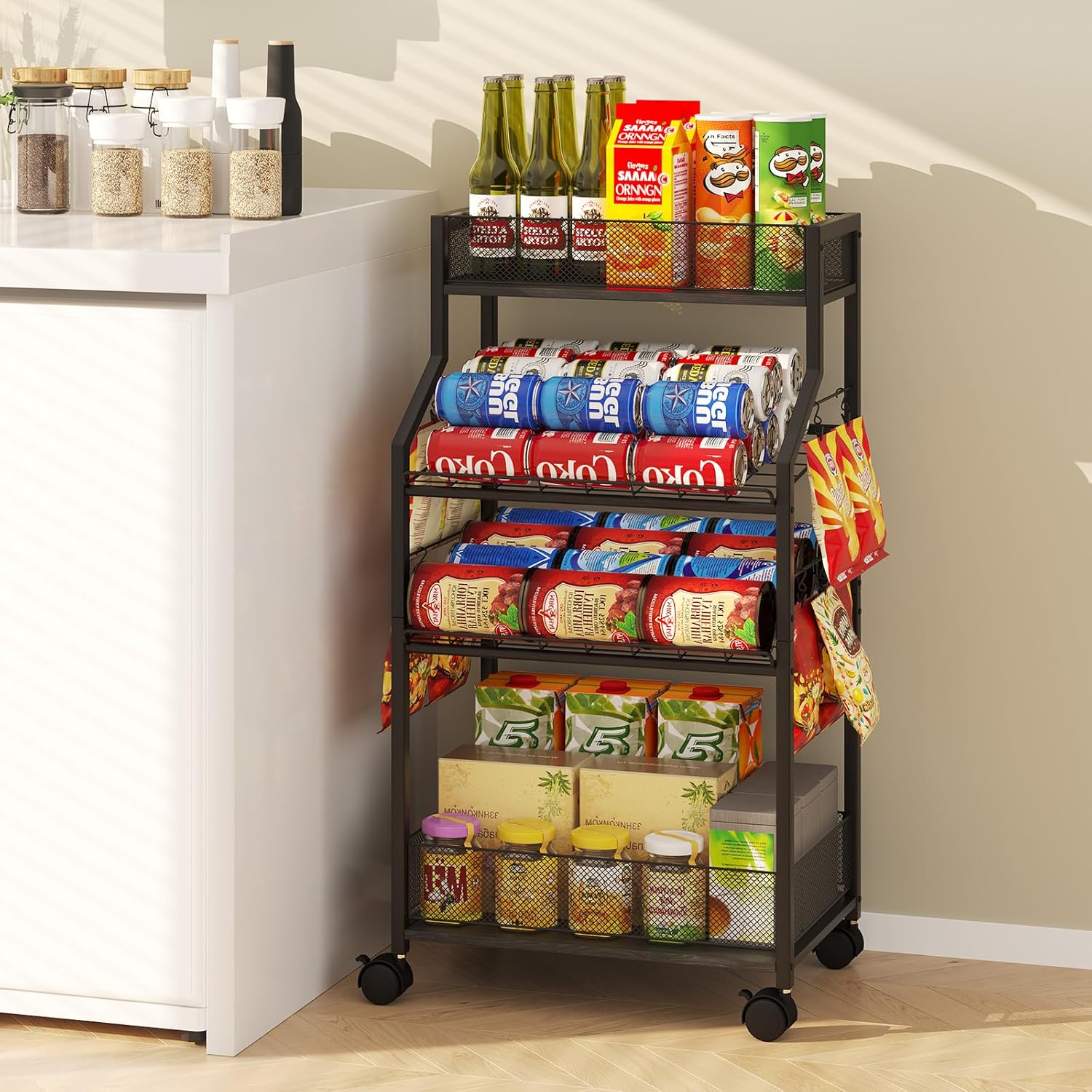 Can Organizer for Pantry - Rolling Snack Cart, Multi-Layer Soda Can Organizer for Pantry, Mobile Beverage Storage Rack with Wheels, Versatile Metal Shelf for Kitchen and Office, Black Brown