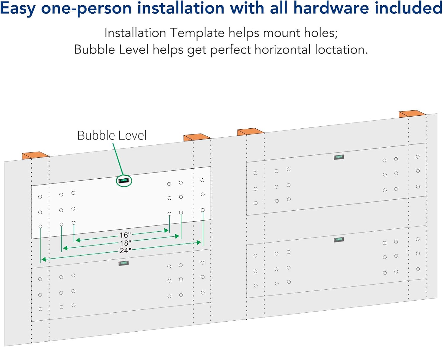 Easy one-person installation with all hardware included. Installation Template helps mount holes. (Assembly needed DIY project) Bubble Level helps get perfect horizontal loctation.