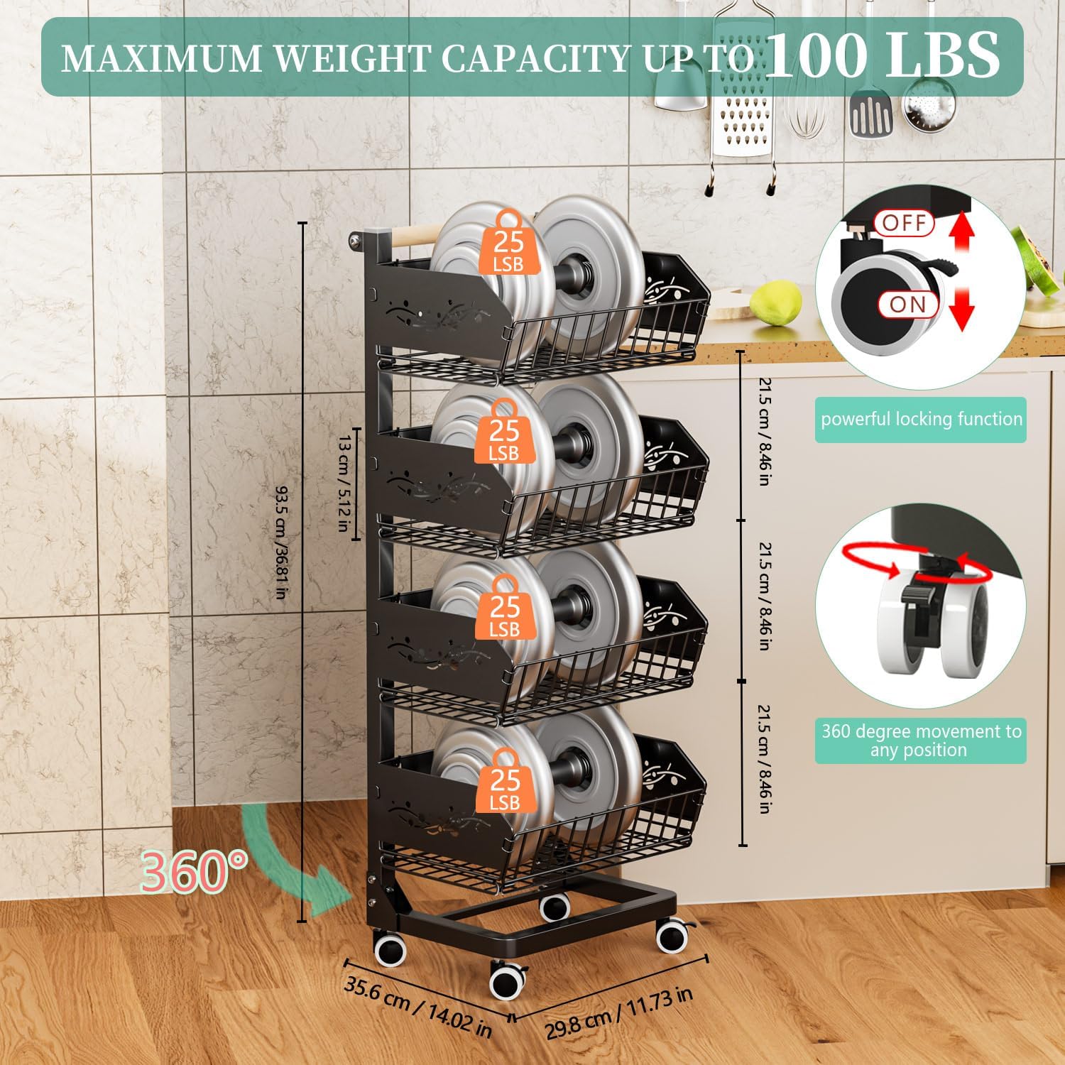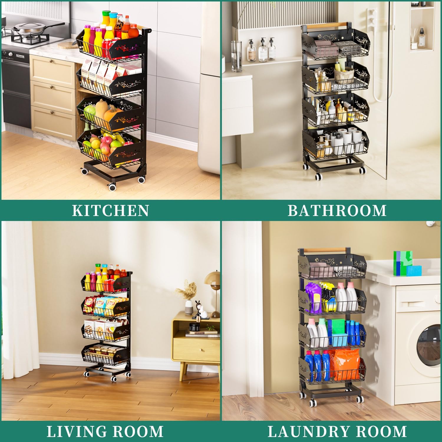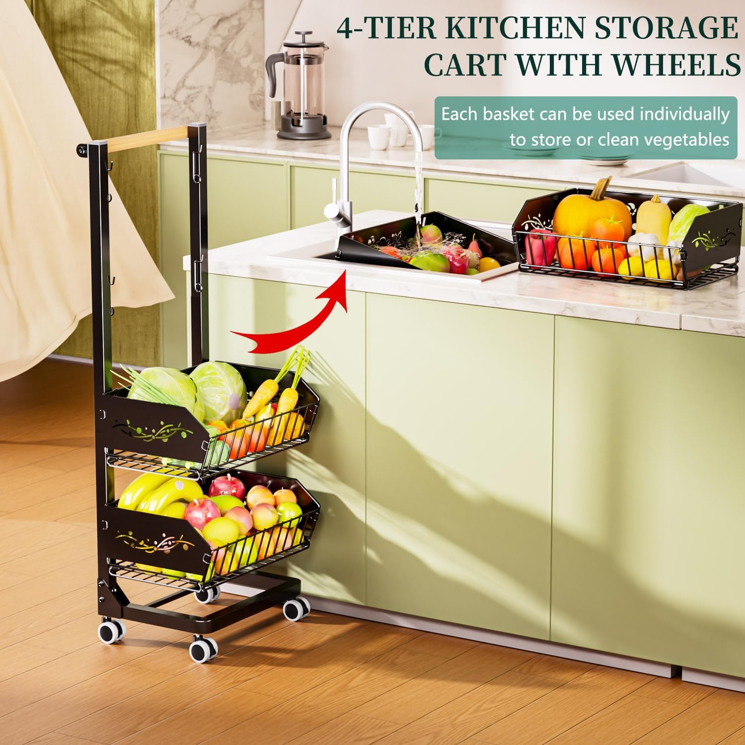 Our 4-tier storage cart is perfect for storing fresh fruits and vegetables. Whether you're storing items or washing vegetables, each basket can be easily removed for individual use, making it ideal for organizing kitchen essentials.