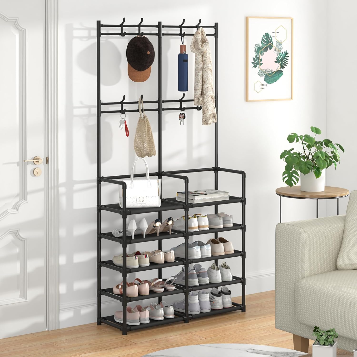 Laiensia 5-Tier Entryway Coat Rack, Coat and Shoe Rack, Entryway Bench Storage Organizer with 8 Hooks for Bedroom, Hallway, Office, Black