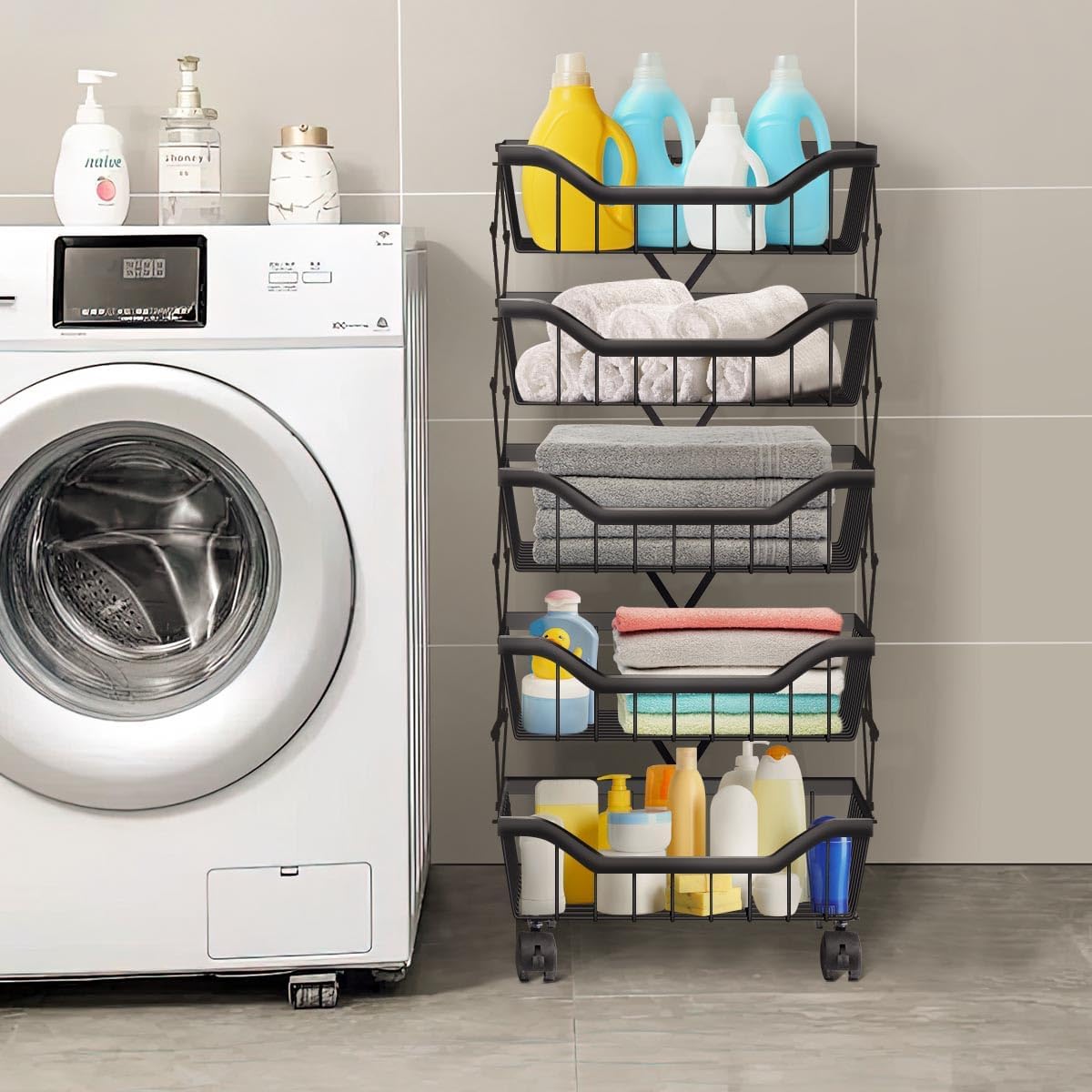 Newzeal Fruit Vegetable Storage Basket 5 Tiers Stackable Metal Wire Fruit Basket Kitchen Cart with Wheels Vegetable Storage Holder for Onions Potatoes Bread Snack Veggie, Black