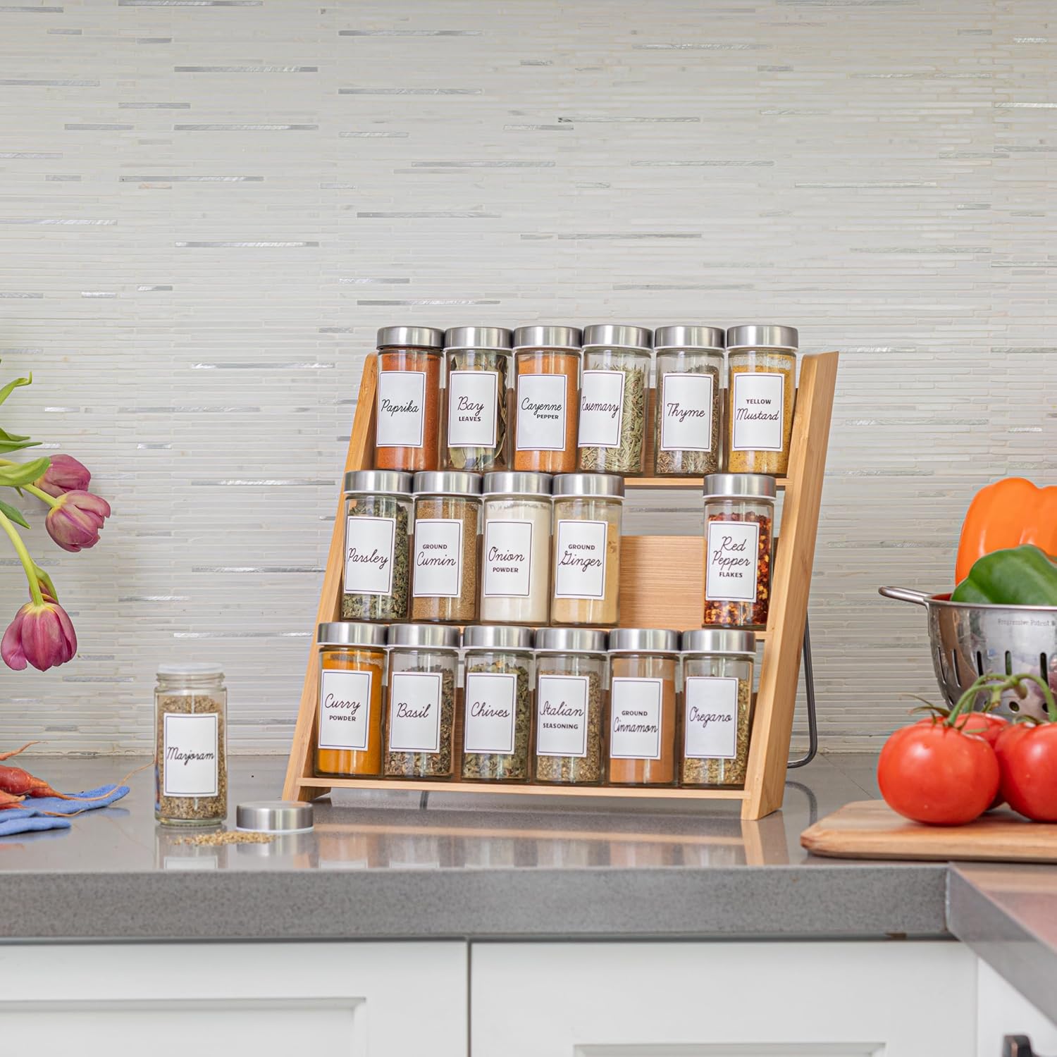 Orii 18 Jar Bamboo Compact Spice Organizer for Countertop and Kitchen Drawer, Filled with Spices, Program