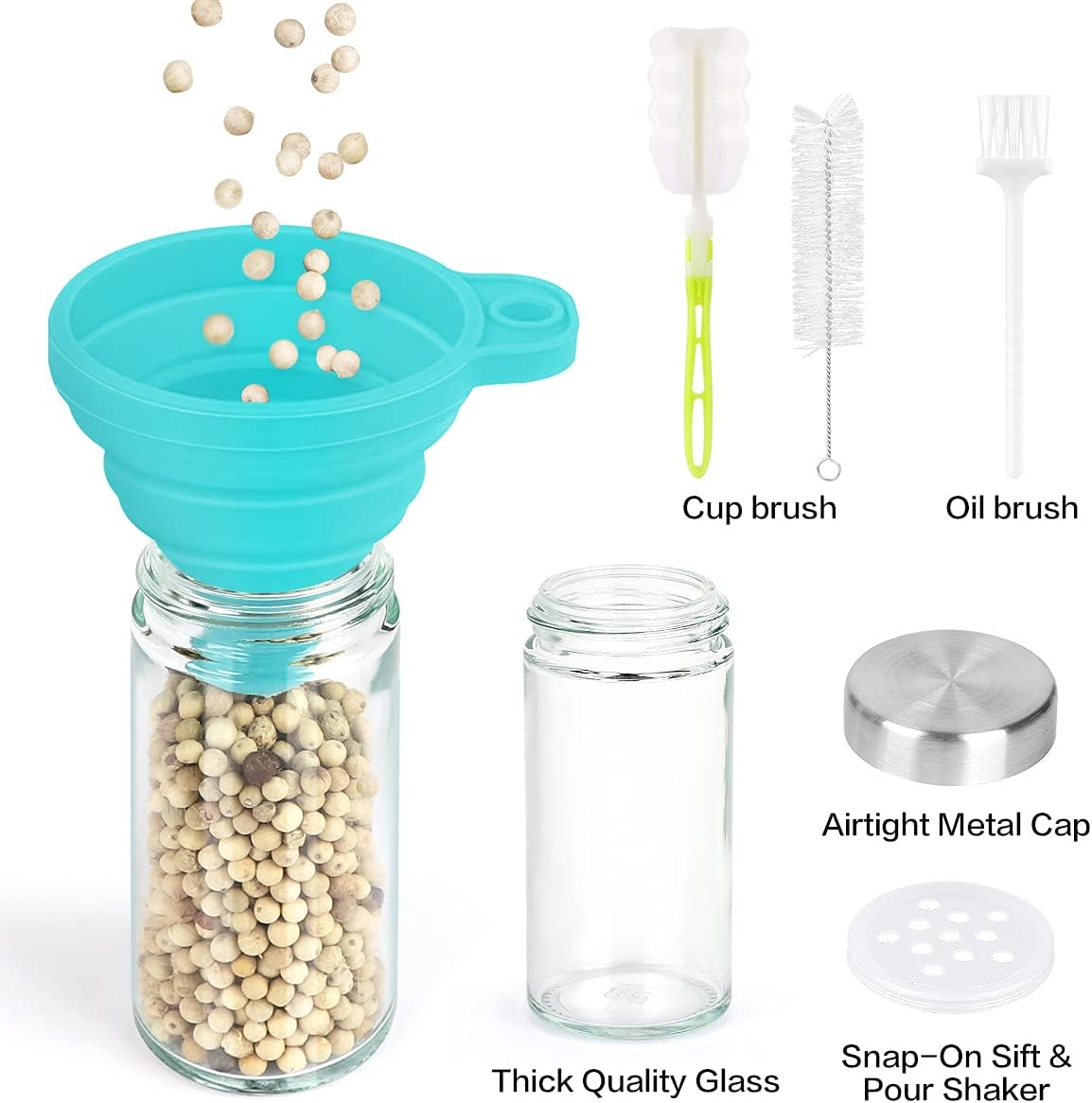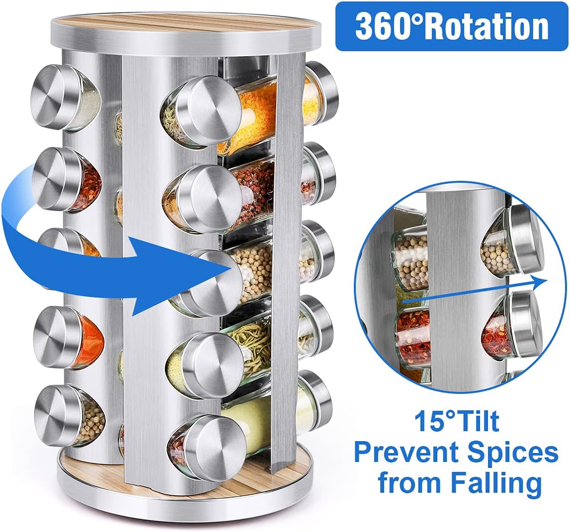 Spice Rack Organizer with Jars for Cabinet (20Pcs) Revolving/Rotating Seasoning Organizer, Stainless Steel/Wooden Countertop Rack Tower Organizer for Kitchen Pantry with Reusable Labels/Funnel/Brushes