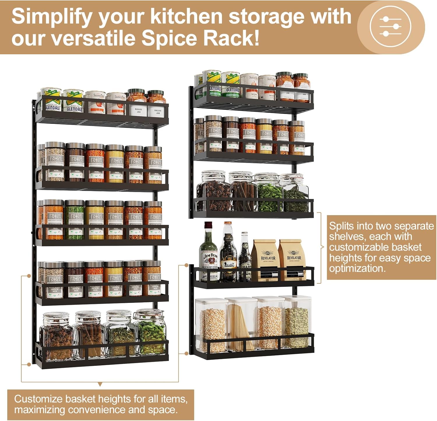 X-cosrack Wall Mount Spice Rack Organizer 5 Tier Height-Adjustable Hanging Spice Shelf Storage for Kitchen Pantry Cabinet, Dual-Use Seasoning Holder Rack with Hooks, Black-Patented