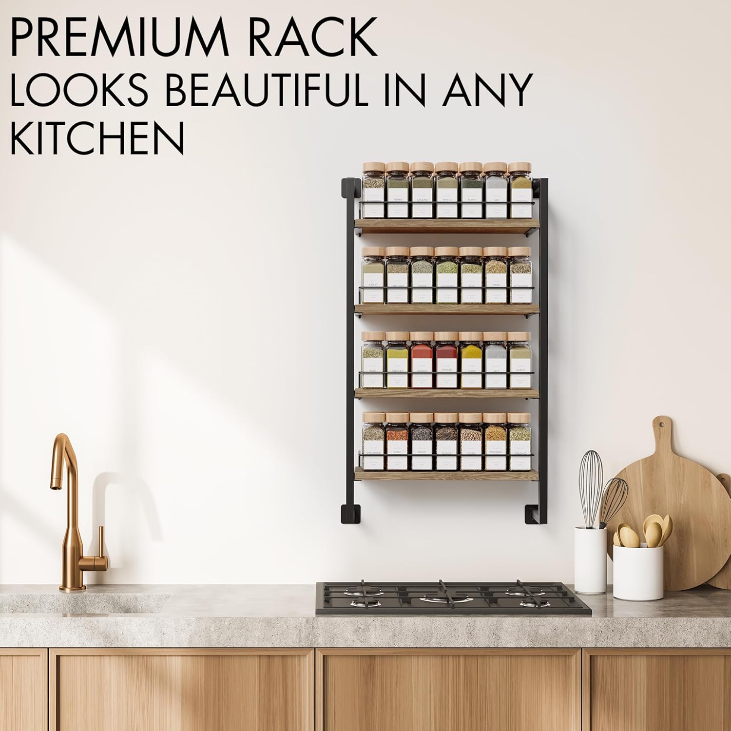 No more digging in cabinets looking for your desired spices! Thanks to the ZICOTO wall mount spice rack organizer set of 4 tiered racks you will spice up your dishes effortlessly as you have all your seasoning well organized and always at your fingertips. The cabinet spice racks offer ample space for all regular-sized 1.75" diameter spice jars and bottles. Mounting the hanging shelf for spice jars is done easily. The hanging hardware is included and with the assembly instruction you have a reliable tool to install the spice rack. A secure fit and clever design makes sure that rattling when opening the cabinet will be at a minimum. Built to last and to shine: The ZICOTO wall mounted spice organizer combine durable, premium quality materials with a stylish, elegant look. The Black finish of the seasoning organizer with the brown wooden shelves fits nicely in any kitchen decor. Finding things in your pantries will be a piece of cake with the space-saving ZICOTO mountable spice rack.